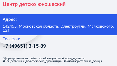 Центр детско-юношеский по адресу 142455, Московская область, Электроугли, Маяковского, 12а в дальнейшем Организация, размещена в следующих категориях: