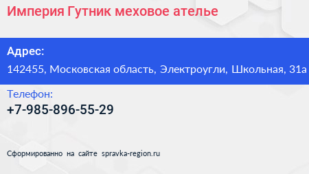 Империя Гутник, меховое ателье по адресу 142455, Московская область, Электроугли, Школьная, 31а в дальнейшем Организация, размещена в следующих категориях: