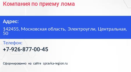 Компания по приему лома по адресу 142455, Московская область, Электроугли, Центральная, 50 в дальнейшем Организация, размещена в следующих категориях: