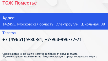 ТСЖ Поместье по адресу 142455, Московская область, Электроугли, Школьная, 38 в дальнейшем Организация, размещена в следующих категориях: