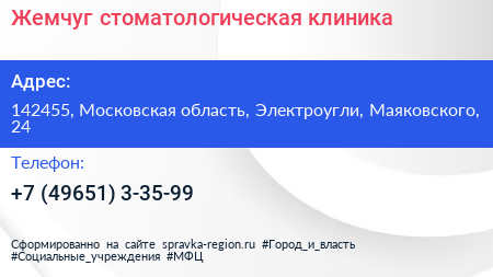 Жемчуг, стоматологическая клиника по адресу 142455, Московская область, Электроугли, Маяковского, 24 в дальнейшем Организация, размещена в следующих категориях: