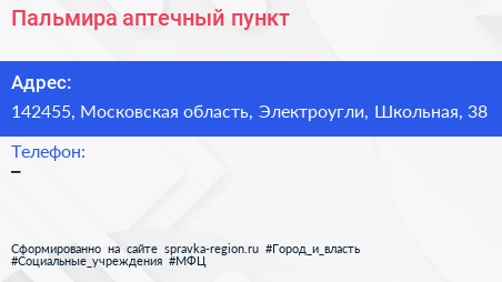 Пальмира, аптечный пункт по адресу 142455, Московская область, Электроугли, Школьная, 38 в дальнейшем Организация, размещена в следующих категориях: