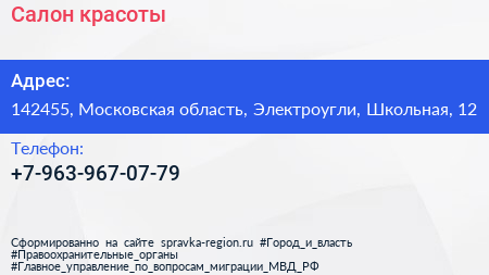 Салон красоты по адресу 142455, Московская область, Электроугли, Школьная, 12 в дальнейшем Организация, размещена в следующих категориях: