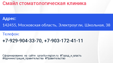 Смайл, стоматологическая клиника по адресу 142455, Московская область, Электроугли, Школьная, 38 в дальнейшем Организация, размещена в следующих категориях: