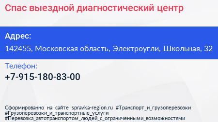 Спас, выездной диагностический центр по адресу 142455, Московская область, Электроугли, Школьная, 32 в дальнейшем Организация, размещена в следующих категориях: