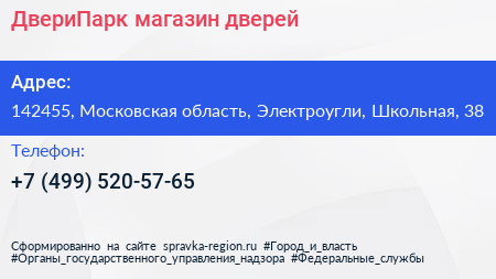 ДвериПарк, магазин дверей по адресу 142455, Московская область, Электроугли, Школьная, 38 в дальнейшем Организация, размещена в следующих категориях: