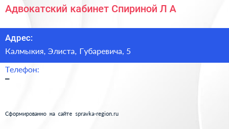 Адвокатский кабинет Спириной Л.А. по адресу Калмыкия, Элиста, Губаревича, 5 в дальнейшем Организация, размещена в следующих категориях: