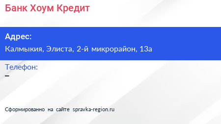 Банк Хоум Кредит по адресу Калмыкия, Элиста, 2-й микрорайон, 13а в дальнейшем Организация, размещена в следующих категориях: