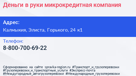 Деньги в руки, микрокредитная компания по адресу Калмыкия, Элиста, Горького, 24 к1 в дальнейшем Организация, размещена в следующих категориях: