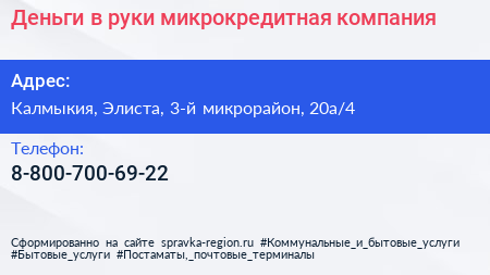 Деньги в руки, микрокредитная компания по адресу Калмыкия, Элиста, 3-й микрорайон, 20а/4 в дальнейшем Организация, размещена в следующих категориях: