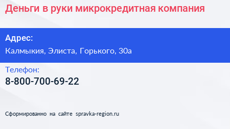 Деньги в руки, микрокредитная компания по адресу Калмыкия, Элиста, Горького, 30а в дальнейшем Организация, размещена в следующих категориях: