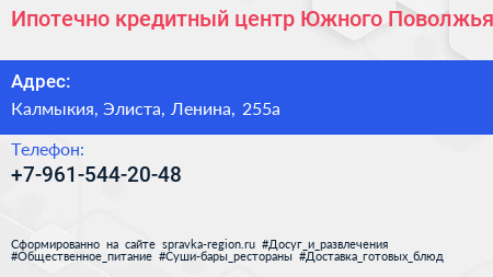 Ипотечно-кредитный центр Южного Поволжья по адресу Калмыкия, Элиста, Ленина, 255а в дальнейшем Организация, размещена в следующих категориях:
