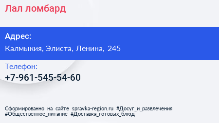Лал, ломбард по адресу Калмыкия, Элиста, Ленина, 245 в дальнейшем Организация, размещена в следующих категориях:
