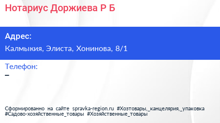 Нотариус Доржиева Р.Б. по адресу Калмыкия, Элиста, Хонинова, 8/1 в дальнейшем Организация, размещена в следующих категориях: