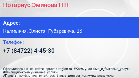 Нотариус Эминова Н.Н. по адресу Калмыкия, Элиста, Губаревича, 16 в дальнейшем Организация, размещена в следующих категориях: