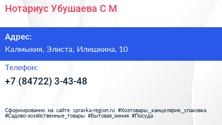 Нотариус Убушаева С.М. по адресу Калмыкия, Элиста, Илишкина, 10 в дальнейшем Организация, размещена в следующих категориях: