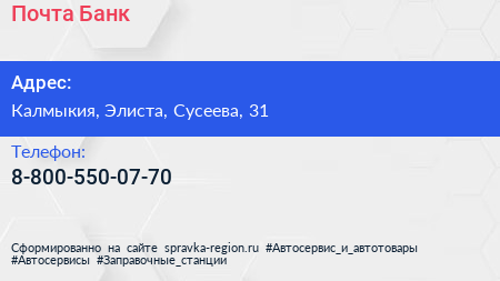 Почта Банк по адресу Калмыкия, Элиста, Сусеева, 31 в дальнейшем Организация, размещена в следующих категориях: