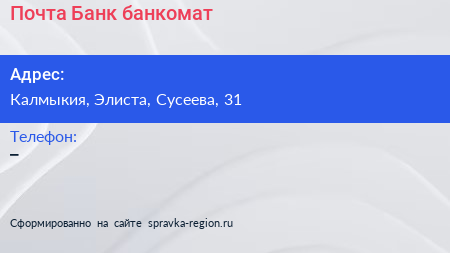 Почта Банк, банкомат по адресу Калмыкия, Элиста, Сусеева, 31 в дальнейшем Организация, размещена в следующих категориях:
