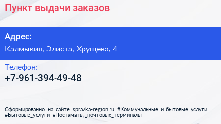 Пункт выдачи заказов по адресу Калмыкия, Элиста, Хрущева, 4 в дальнейшем Организация, размещена в следующих категориях: