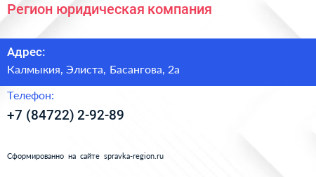 Регион, юридическая компания по адресу Калмыкия, Элиста, Басангова, 2а в дальнейшем Организация, размещена в следующих категориях: