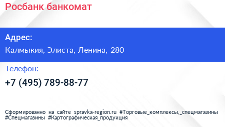 Росбанк, банкомат по адресу Калмыкия, Элиста, Ленина, 280 в дальнейшем Организация, размещена в следующих категориях:
