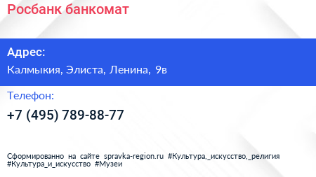 Росбанк, банкомат по адресу Калмыкия, Элиста, Ленина, 9в в дальнейшем Организация, размещена в следующих категориях: