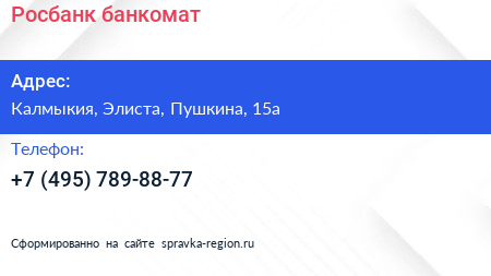 Росбанк, банкомат по адресу Калмыкия, Элиста, Пушкина, 15а в дальнейшем Организация, размещена в следующих категориях: