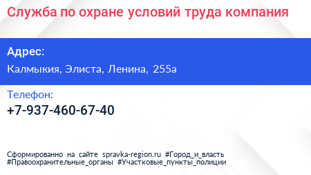 Служба по охране условий труда, компания по адресу Калмыкия, Элиста, Ленина, 255а в дальнейшем Организация, размещена в следующих категориях: