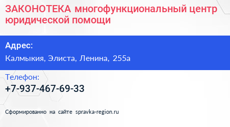 ЗАКОНОТЕКА, многофункциональный центр юридической помощи по адресу Калмыкия, Элиста, Ленина, 255а в дальнейшем Организация, размещена в следующих категориях: