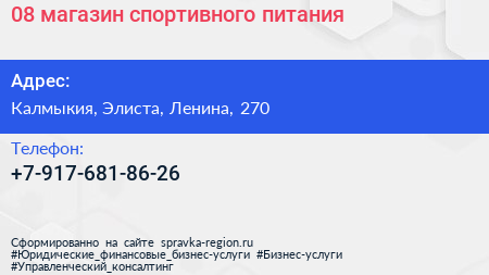 08, магазин спортивного питания по адресу Калмыкия, Элиста, Ленина, 270 в дальнейшем Организация, размещена в следующих категориях: