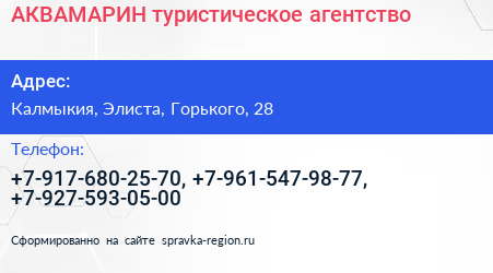 АКВАМАРИН, туристическое агентство по адресу Калмыкия, Элиста, Горького, 28 в дальнейшем Организация, размещена в следующих категориях: