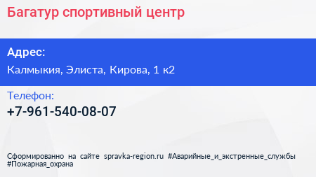 Багатур, спортивный центр по адресу Калмыкия, Элиста, Кирова, 1 к2 в дальнейшем Организация, размещена в следующих категориях: