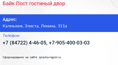 Байк-Пост, гостиный двор по адресу Калмыкия, Элиста, Ленина, 311а в дальнейшем Организация, размещена в следующих категориях: