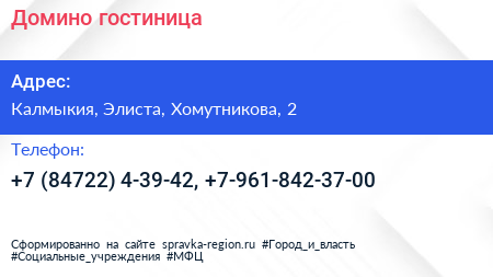 Домино, гостиница по адресу Калмыкия, Элиста, Хомутникова, 2 в дальнейшем Организация, размещена в следующих категориях: