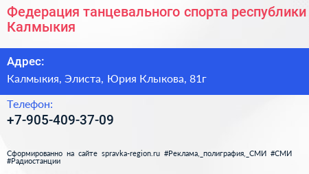 Федерация танцевального спорта республики Калмыкия по адресу Калмыкия, Элиста, Юрия Клыкова, 81г в дальнейшем Организация, размещена в следующих категориях: