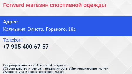 Forward, магазин спортивной одежды по адресу Калмыкия, Элиста, Горького, 18а в дальнейшем Организация, размещена в следующих категориях: