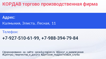 КОРДАВ, торгово-производственная фирма по адресу Калмыкия, Элиста, Лесная, 11 в дальнейшем Организация, размещена в следующих категориях: