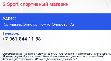 S-Sport, спортивный магазин по адресу Калмыкия, Элиста, Номто Очирова, 7а в дальнейшем Организация, размещена в следующих категориях: