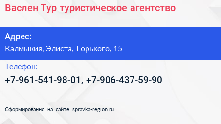 Васлен-Тур, туристическое агентство по адресу Калмыкия, Элиста, Горького, 15 в дальнейшем Организация, размещена в следующих категориях: