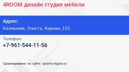 4ROOM, дизайн-студия мебели по адресу Калмыкия, Элиста, Кирова, 155 в дальнейшем Организация, размещена в следующих категориях: