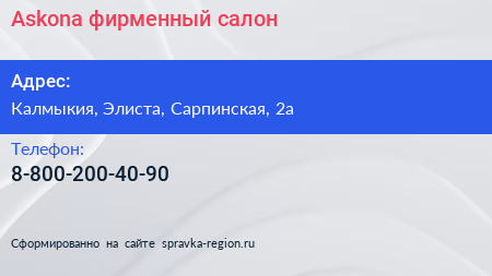 Askona, фирменный салон по адресу Калмыкия, Элиста, Сарпинская, 2а в дальнейшем Организация, размещена в следующих категориях: