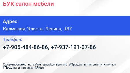 БУК, салон мебели по адресу Калмыкия, Элиста, Ленина, 187 в дальнейшем Организация, размещена в следующих категориях: