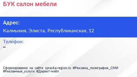 БУК, салон мебели по адресу Калмыкия, Элиста, Республиканская, 12 в дальнейшем Организация, размещена в следующих категориях: