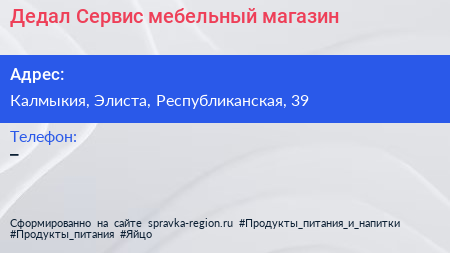 Дедал-Сервис, мебельный магазин по адресу Калмыкия, Элиста, Республиканская, 39 в дальнейшем Организация, размещена в следующих категориях: