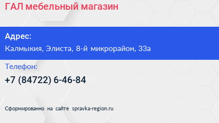 ГАЛ, мебельный магазин по адресу Калмыкия, Элиста, 8-й микрорайон, 33а в дальнейшем Организация, размещена в следующих категориях: