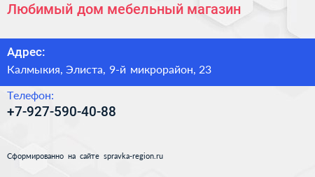 Любимый дом, мебельный магазин по адресу Калмыкия, Элиста, 9-й микрорайон, 23 в дальнейшем Организация, размещена в следующих категориях: