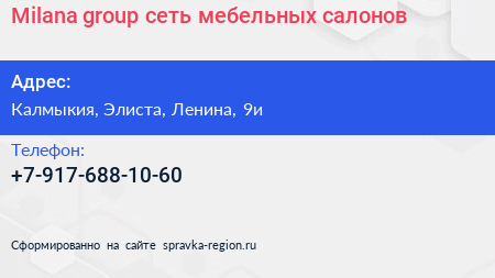 Milana group, сеть мебельных салонов по адресу Калмыкия, Элиста, Ленина, 9и в дальнейшем Организация, размещена в следующих категориях: