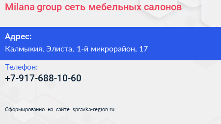 Milana group, сеть мебельных салонов по адресу Калмыкия, Элиста, 1-й микрорайон, 17 в дальнейшем Организация, размещена в следующих категориях: