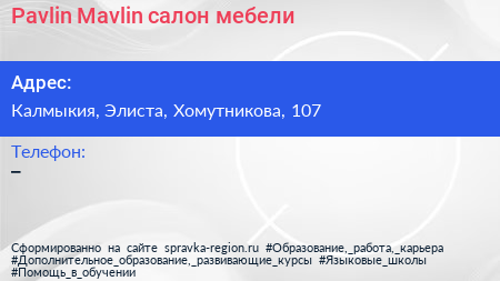 Pavlin Mavlin, салон мебели по адресу Калмыкия, Элиста, Хомутникова, 107 в дальнейшем Организация, размещена в следующих категориях: