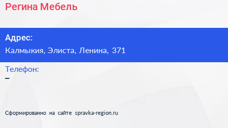 Регина-Мебель по адресу Калмыкия, Элиста, Ленина, 371 в дальнейшем Организация, размещена в следующих категориях: